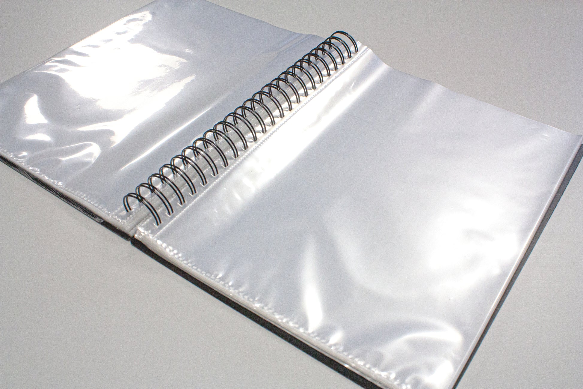 - Strong black 800 micron cover fold flat spiral display book with clear 150 micron A4 size sleeve on front cover for personalisation and presentation.